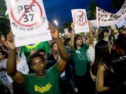 A Câmara dos Deputados rejeitou esta noite (25 jun) a PEC 37, proposta de emenda constitucional que pretendia tirar o poder de investigação do Ministério Público, estabelecido pela Constituição de 1988. Foram 430 votos contra e 9 a favor, além de duas abstenções. Quando o povo sai às ruas, tudo muda. Ficou difícil para os nobres deputados contrariar a voz das multidões, especialmente às vésperas de uma nova eleição.